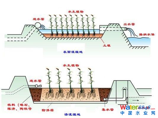 人工濕地系統(tǒng)又分為:表面流濕地(FWS)、潛流濕地(SFS)。