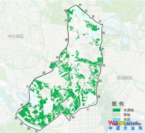 。2)農(nóng)業(yè)源。區(qū)域耕地面積為166平方公里,其中東麗區(qū)27平方公里,津南區(qū)94平方公里,西青區(qū)26平方公里,濱海新區(qū)18平方公里,寧河區(qū)1平方公里。耕地面積中基本農(nóng)田75.86平方公里,占耕地面積的45.78%。耕地包括水澆地164.79平方公里、水田0.78平方公里及旱地0.01平方公里,分布范圍如圖2-3所示,主要集中于試點(diǎn)范圍內(nèi)中部和南部區(qū)域。區(qū)域內(nèi)現(xiàn)有規(guī);笄蒺B(yǎng)殖場主要養(yǎng)殖品種為生豬和肉雞、蛋雞。區(qū)域內(nèi)水產(chǎn)養(yǎng)殖面積8.7平方公里(約1.3萬畝),多分布于河湖附近,對水質(zhì)產(chǎn)生一定影響。種植業(yè)節(jié)水力度不足,如津南區(qū)農(nóng)田灌溉水有效利用系數(shù)僅為0.54。農(nóng)業(yè)源仍是區(qū)域內(nèi)重要的污染來源。