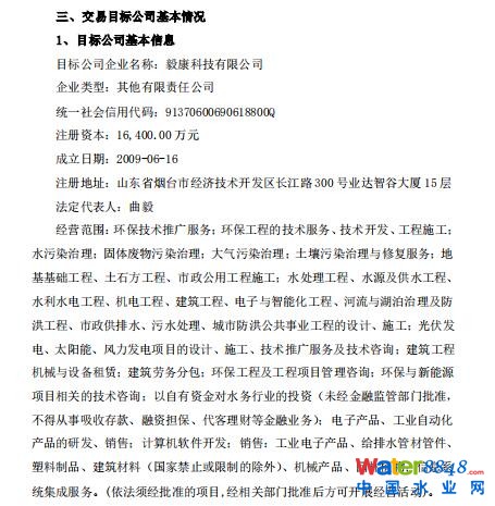 被并購(gòu)方毅康科技是新型污水治理解決方案提供商,主要從事城鄉(xiāng)供水、污水處理、中水回用、水環(huán)境生態(tài)修復(fù)、黑臭水體治理、污泥資源化利用、固廢及危廢處理等領(lǐng)域的投資運(yùn)營(yíng)。業(yè)務(wù)以山東為中軸,向北往遼寧、黑龍江、河北、甘肅發(fā)展,向南往河南、四川、安徽、江蘇、廣東發(fā)展。