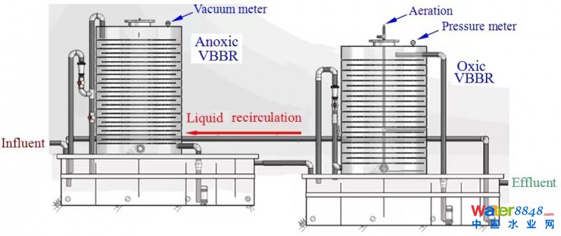 隨后,上海師范大學環(huán)境工程系張永明教授團隊與邁奇化學股份有限公司合作,利用自主研發(fā)的專利技術(ZL2015 1 0510978.7和ZL2019 1 0930412.8):垂直折流式生物反應器(Vertical Baffled Bioreactor, VBBR, 如圖2所示),將邁奇化學股份有限公司的NMP廢水作為電子供體,實現了城鎮(zhèn)污水處理廠尾水的深度脫氮,經過處理后的出水總氮濃度低于5 mg/L,且出水COD濃度不會增加。
