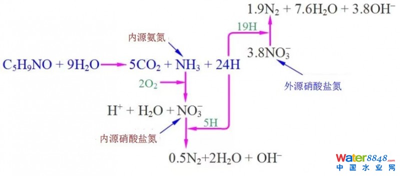 N-甲基吡咯烷酮(N-methyl pyrrolidone, NMP)是鋰電池等生產中必不可少的工業(yè)溶劑。隨著新能源產業(yè)在我國的快速發(fā)展,NMP的需求量不斷增加,相應地生產NMP過程中所產生的廢水量也不斷增加。NMP是一種雜環(huán)化合物,其分子式為C5H9NO。含有NMP的廢水特點是COD和總氮濃度都很高,但可生化性較好。以往針對NMP廢水進行生物處理時,不僅需要大量的動力消耗,同時還浪費了有限的有機碳源。上海師范大學張永明教授團隊在國際上首次通過對NMP生物代謝的電子流分析發(fā)現,若將NMP作為電子供體進行反硝化時,其中79%的電子供體可以用于外源硝酸鹽的還原(圖1)。在理論研究的基礎上,通過實驗室研究發(fā)現,通過厭(缺)氧與好氧交替,可以使外源硝酸鹽得到還原,同時也可以使自身的內源氮素得到去除。