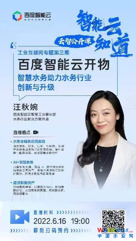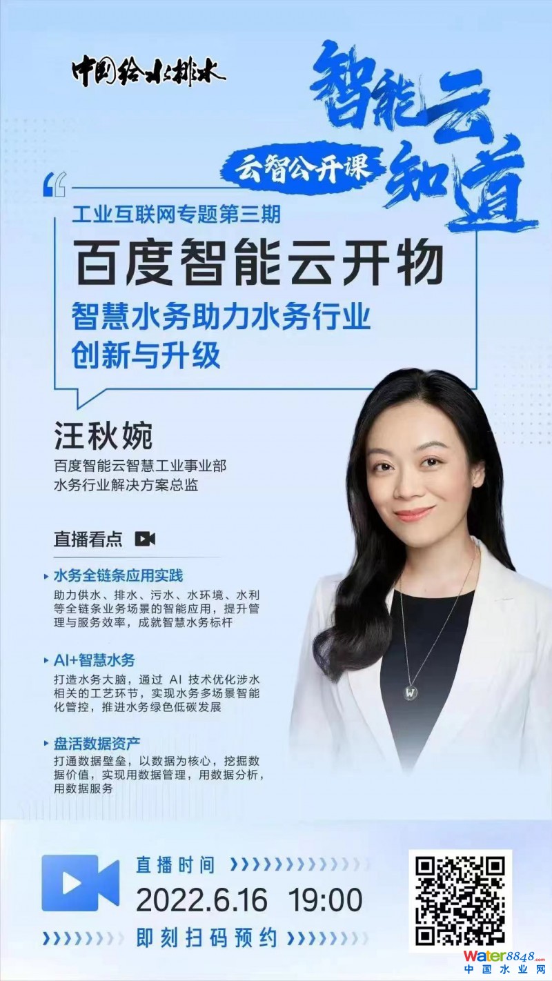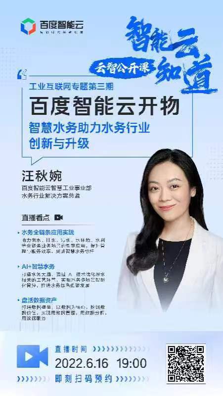 2022年6月16日19點(diǎn), "智能云知道-云智公開課"工業(yè)互聯(lián)網(wǎng)專場第三期——智慧水務(wù)助力水務(wù)行業(yè)創(chuàng)新與升級(jí)線上直播將準(zhǔn)時(shí)上線,邀請您與百度智能云智慧工業(yè)事業(yè)部水務(wù)行業(yè)解決方案總監(jiān)汪秋婉一起,探討百度智能云智慧水務(wù)優(yōu)勢、應(yīng)用場景與實(shí)踐。