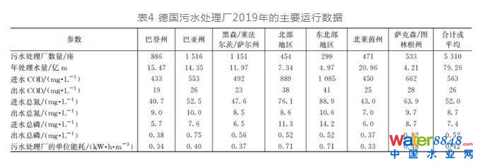 國內(nèi)污水處理廠的能耗水平與歐美發(fā)達國家相比究竟怎樣呢?國內(nèi)文獻中較多出現(xiàn)的觀點是國內(nèi)污水處理廠的能耗水平明顯高于歐美發(fā)達國家。但筆者認為未必如此,污水處理廠的能耗水平與其建設標準和處理標準直接相關(guān),不是同一基礎(chǔ)上的數(shù)據(jù)不具有可比性。國內(nèi)污水處理廠經(jīng)歷近十年的逐次提標,目前的處理標準應該已超過了很多歐美國家的污水處理廠。為滿足高標準的處理需求,近十年來也從國外引進了大量的先進技術(shù)和裝備,應該說目前行業(yè)內(nèi)國際上大多數(shù)先進的工藝、技術(shù)和裝備在國內(nèi)都得到了廣泛的應用。因此至少單純在污水處理廠運行能耗方面國內(nèi)并不比歐美發(fā)達國家差。唐建國在城建水業(yè)上介紹了德國2019年的污水處理情況,德國水協(xié)2019年調(diào)查了全德5 310座污水處理廠的情況,占德國污水處理總規(guī)模的87.2%。其中關(guān)于污水處理廠的主要運行數(shù)據(jù)摘錄如表4所示。