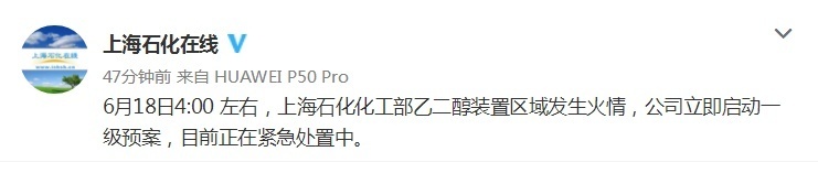 據(jù)中國石化上海石油化工股份有限公司官方微博消息,6月18日4時(shí)左右,上海石化化工部乙二醇裝置區(qū)域發(fā)生火情,公司立即啟動(dòng)一級(jí)預(yù)案,目前正在緊急處置中。