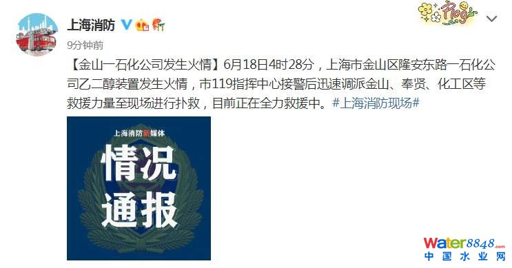 另據(jù)上海消防微博,6月18日4時(shí)28分,上海市金山區(qū)隆安東路一石化公司乙二醇裝置發(fā)生火情,市119指揮中心接警后迅速調(diào)派金山、奉賢、化工區(qū)等救援力量至現(xiàn)場(chǎng)進(jìn)行撲救,目前正在全力救援中。