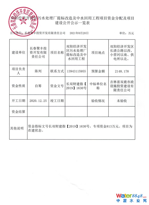雙陽經(jīng)濟開發(fā)區(qū)污水處理廠提標(biāo)改造及中水回收工程項目資金分配及項目建設(shè)公開公示一覽表