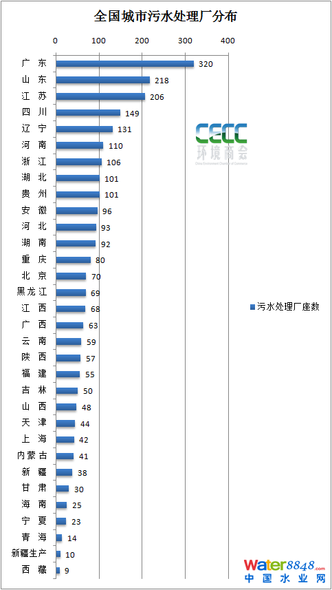 截至2020年,全國城市污水處理能力分布(按照各省市污水處理廠數(shù)量排序):