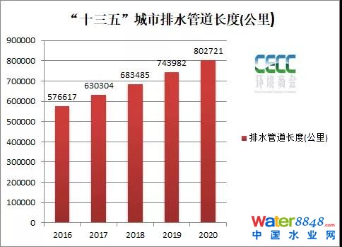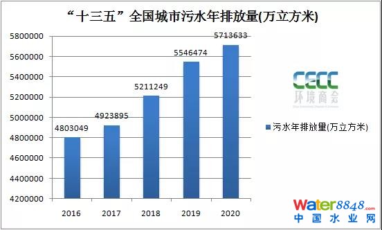“十三五”時(shí)期,我國城市污水處理率達(dá)97.53%,城市排水管網(wǎng)長度達(dá)802721公里,較“十二五”末增長約48.8%。截止2020年,全國污水排放量達(dá)5713633萬立方米,較“十二五”末增長22.44%。污水年處理量達(dá)5572782立方米,較“十二五”增長30%。