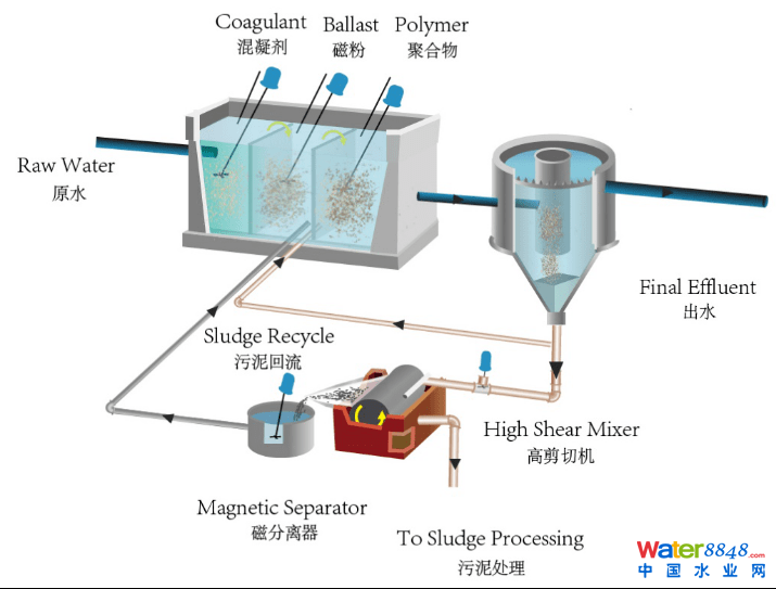 磁分離器和高剪切機等磁粉回收設(shè)備是磁混凝沉淀系統(tǒng)的核心設(shè)備。可靠的磁分離器是保障磁粉回收率的核心,可有效降低磁粉補充率及運行成本。