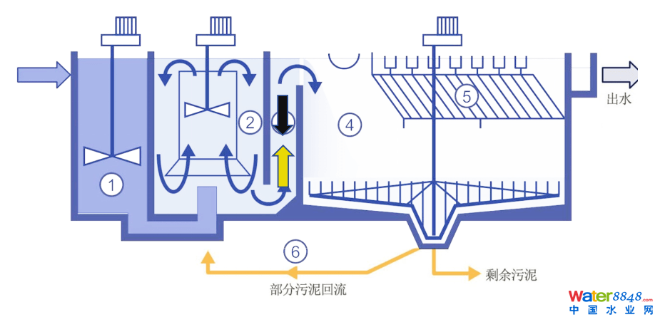 ① 傳統(tǒng)高效沉淀絮凝區(qū)為底部進水,從混凝區(qū)底部由管道連接至絮凝區(qū),完全通過水力過流。如果投加磁粉,勢必在過水管中行程磁粉淤積,造成堵塞。