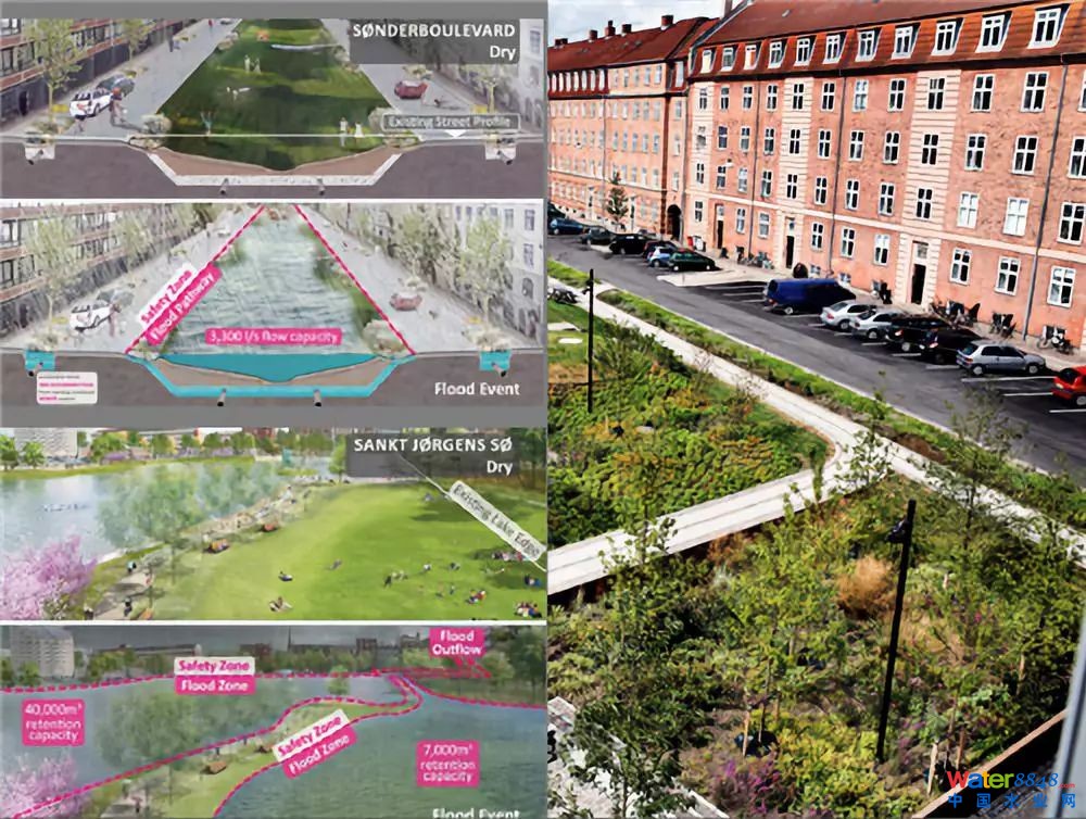 2011年,丹麥哥本哈根經(jīng)歷了一場非常嚴(yán)重的洪災(zāi),洪災(zāi)之后的重建費用大概花了9億歐元。哥本哈根對這次洪災(zāi)的應(yīng)對是重新制訂了暴雨計劃,利用藍(lán)色、綠色、灰色基礎(chǔ)設(shè)施融合的方法提高城市復(fù)原能力,進(jìn)行藍(lán)綠改造。