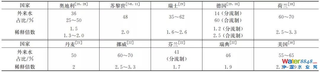 表2 歐洲(和美國(guó))污水管網(wǎng)外來(lái)水占比和稀釋倍數(shù)