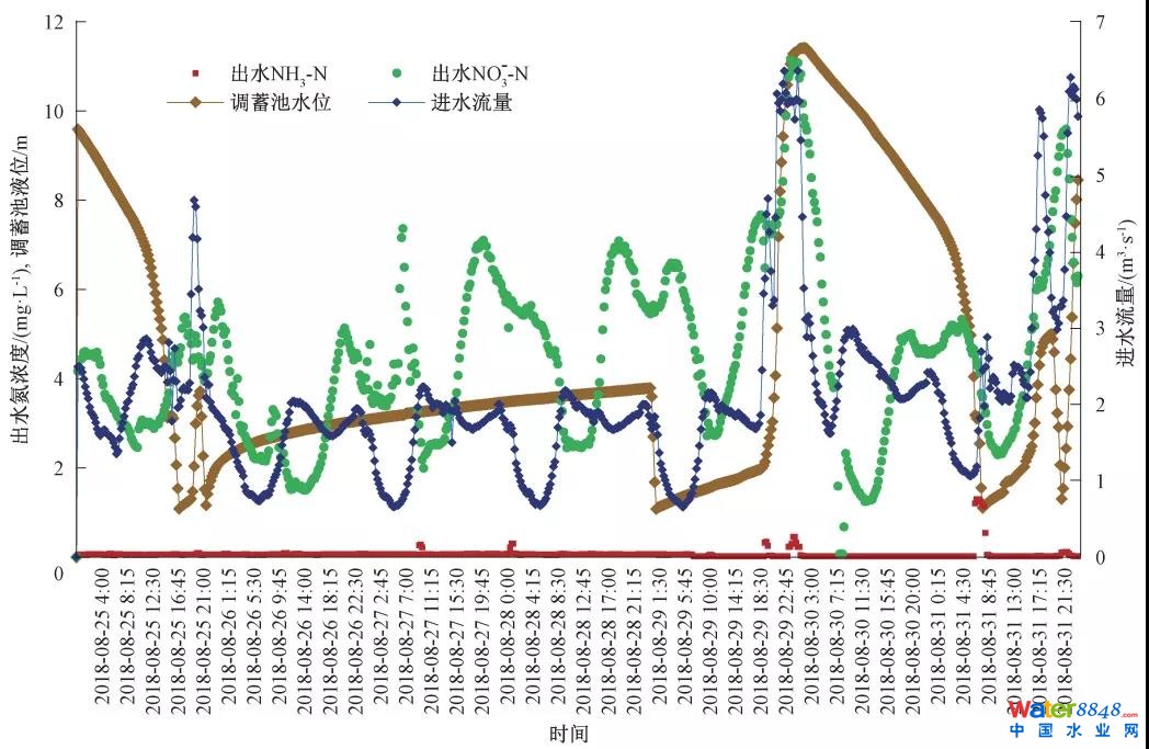 圖2 瑞士蘇黎世Werdhölzli污水處理廠雨季(2018年8月25至8月31日)進(jìn)水流量、出水氨氮即硝態(tài)氮及調(diào)蓄池水位在線測(cè)量數(shù)據(jù)