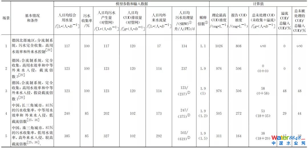 表4 五種不同場(chǎng)景下模型參數(shù)、輸入數(shù)據(jù)和污水COD濃度及溢流負(fù)荷計(jì)算值