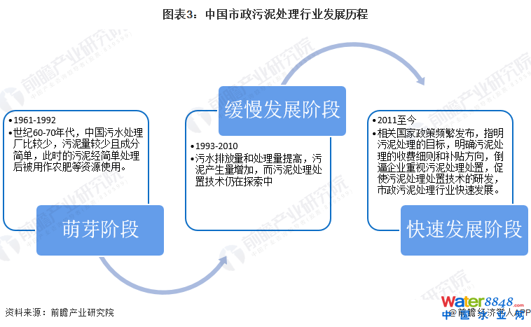 自20世紀(jì)60年代起,中國(guó)污泥處理行業(yè)經(jīng)歷了萌芽、緩慢發(fā)展、快速發(fā)展三大階段。