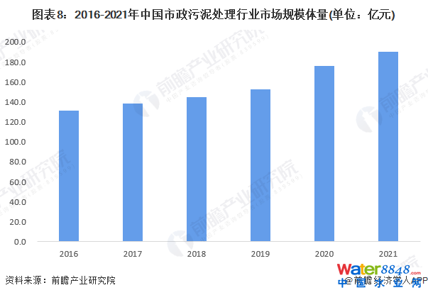 此處假設(shè)中國市政污泥處理行業(yè)的價格在六年間不發(fā)生變化,據(jù)此測算,2021年中國市政污泥處理行業(yè)的市場規(guī)模為190.4億元。