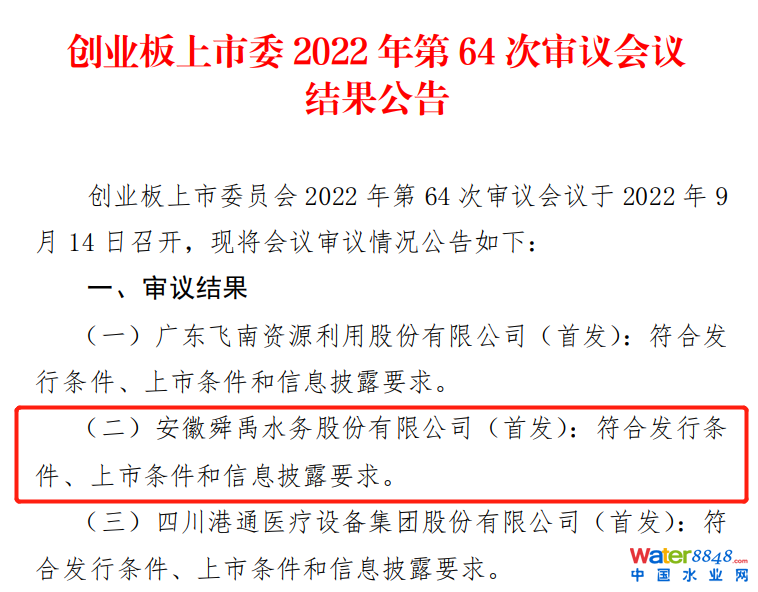 創(chuàng)業(yè)板上市委9月14日召開2022年第64次審議會議,審議結(jié)果顯示,安徽舜禹水務(wù)股份有限公司首發(fā)獲通過。