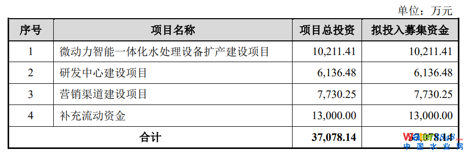 本次IPO,舜禹水務(wù)擬發(fā)行數(shù)量不超過4116萬股人民幣普通股(A股),擬募資約3.71億元,將用于微動力智能一體化水處理設(shè)備擴(kuò)產(chǎn)建設(shè)項(xiàng)目、研發(fā)中心建設(shè)項(xiàng)目、營銷渠道建設(shè)項(xiàng)目建設(shè),以及補(bǔ)充流動資金。