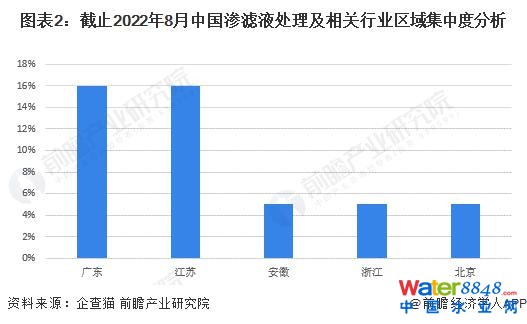 中國滲濾液處理行業(yè)的企業(yè)大多為地方性企業(yè),總體市場(chǎng)集中度不高。截至 2022 年 8 月,分區(qū)域來看,江蘇省與廣東省滲濾液處理企業(yè)集中度較高,分別占比 16%。第三名為安徽省,占比 5%?傮w來看,滲濾液處理行業(yè)除江蘇、廣東省外,區(qū)域競(jìng)爭較為分散,多為地方性企業(yè)。