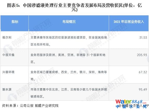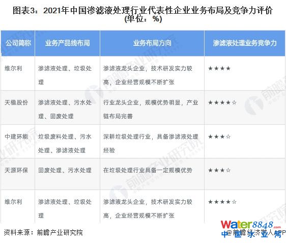 前瞻結(jié)合中國滲濾液處理行業(yè)主要企業(yè)的滲濾液處理業(yè)務(wù)營收規(guī)模和企業(yè)主要聚焦業(yè)務(wù)類型,并通過對(duì)比企業(yè)技術(shù)規(guī)模發(fā)展現(xiàn)狀,總結(jié)出目前中國滲濾液處理行業(yè)企業(yè)布局以及競(jìng)爭力評(píng)價(jià),綜合來看目前行業(yè)內(nèi)具備規(guī)模優(yōu)勢(shì)的企業(yè)主要由維爾利、天楹股份和首創(chuàng)環(huán)保等: