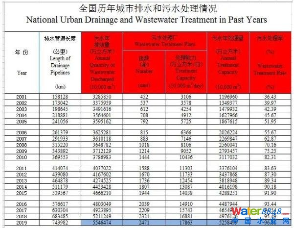 2019年,全國縣城污水年排放量為102.3億立方米,污水處理廠1669座,處理能力3587萬立方米/日,年污水處理總量為95.01億立方米,污水處理率達93.55%。 |