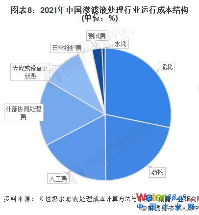 在水耗、能耗、藥耗、人工費(fèi)、維修、大修、外部費(fèi)用等滲濾液處理成本中,前三名能耗、藥耗、人工費(fèi)分別占運(yùn)行成本直接費(fèi)用的 28.21%、21.67% 與 17.44%。