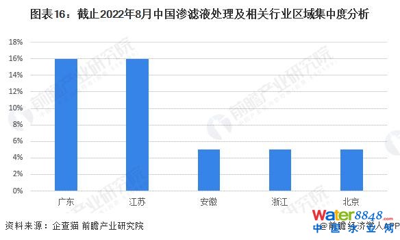 中國滲濾液處理行業(yè)的企業(yè)大多為地方性企業(yè),總體市場集中度不高。截至 2022 年 8 月,分區(qū)域來看,江蘇省與廣東省滲濾液處理企業(yè)集中度較高,分別占比 16%。第三名為安徽省,占比 5%?傮w來看,滲濾液處理行業(yè)除江蘇、廣東省外,區(qū)域競爭較為分散,多為地方性企業(yè)。