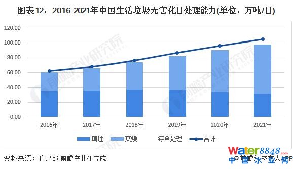 根據(jù)住建部的統(tǒng)計數(shù)據(jù),2016-2021 年我國生活垃圾無害化能力逐年增長,2020 年我國生活垃圾無害化處理能力實(shí)現(xiàn) 96.34 萬噸 / 日,其中垃圾填埋無害化處理能力 33.78 萬噸 / 日,垃圾焚燒無害化處理能力 56.78 萬噸 / 日,垃圾綜合處理無害化處理能力 5.78 萬噸 / 日。據(jù)初步核算,2021 年我國生活垃圾無害化處理能力達(dá)到 105.34 萬噸 / 日。