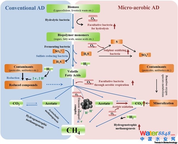 厭氧消化技術(shù)在有機(jī)固廢資源化以及可再生能源生產(chǎn)領(lǐng)域受到越來越多的關(guān)注。然而由于秸稈類有機(jī)固廢結(jié)構(gòu)復(fù)雜,其厭氧消化往往存在產(chǎn)氣效率低、發(fā)酵周期長的問題。針對此問題,中科院青島能源所郭榮波研究員帶領(lǐng)的工業(yè)生物燃?xì)庵行幕谏镎{(diào)控策略創(chuàng)新性提出厭氧消化的微好氧調(diào)控技術(shù),并取得系列成果(Bioresource Technology, 2015, 175, 203-208; Chemical Engineering Journal, 2016, 287, 523-528; Fuel, 2022, 318, 123604; Renewable Energy,2022, 195, 1194-1201; Bioresource Technology,2022, 359, 127454)。在此基礎(chǔ)上,近期該研究組聯(lián)合丹麥技術(shù)大學(xué)厭氧消化領(lǐng)域權(quán)威專家IriniAngelidaki在生物技術(shù)領(lǐng)域權(quán)威期刊Trends in Biotechnology中發(fā)表關(guān)于微好氧調(diào)控技術(shù)的綜述文章。 Trends in Biotechnology隸屬于《Cell》子刊,主要刊登關(guān)于應(yīng)用生物技術(shù)領(lǐng)域的綜述和觀點(diǎn),創(chuàng)刊以來刊登過許多重大的生命科學(xué)研究進(jìn)展,最新發(fā)布的影響因子為21.942,中科院分一區(qū)Top期刊(排名4/293位)。