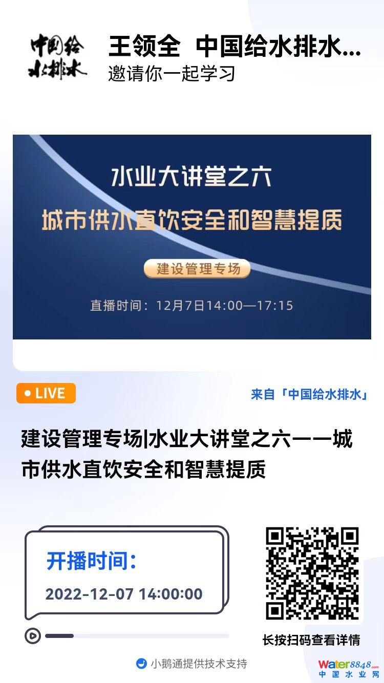 處理工藝專場(chǎng)|水業(yè)大講堂之六——城市供水直飲安全和智慧提質(zhì) 直播時(shí)間:2022年12月8日 8:30—12:15
