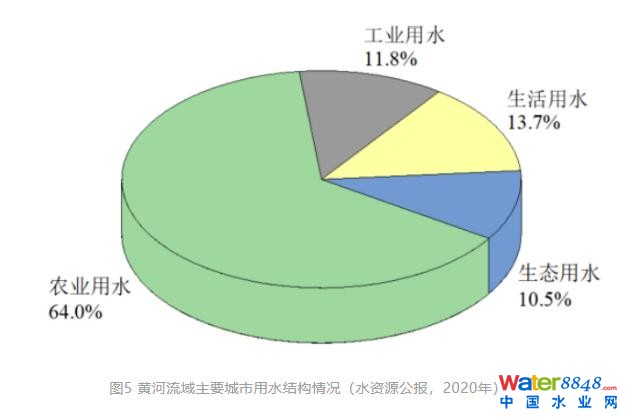 用水量指分配給各類用戶的包括輸水損失在內(nèi)毛用水量,主要涉及農(nóng)業(yè)用水、工業(yè)用水、生活用水和生態(tài)用水四個(gè)方面。2020年,黃河流域主要城市用水總量為675億m3,從用水結(jié)構(gòu)來看,農(nóng)業(yè)用水量最大,達(dá)432億m3,占黃河流域總用水量的64.0%。同期,生活用水、工業(yè)用水和生態(tài)用水用量分別為92億m3、80億m3和71億m3,占比依次為13.7%、11.8%和10.5%。