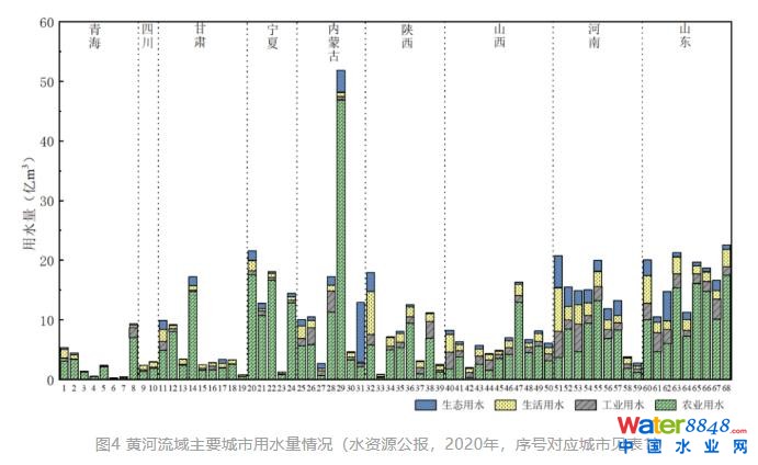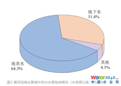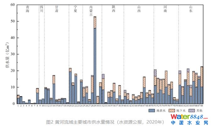 2020年黃河流域68個(gè)主要城市供水總量為675億m3,其中地表水為主要的供水水源,為434億m3,占總供水量的64.3%;地下水供水量為212億m3,占總供水量的31.4%;其他水源(包括再生水、集雨工程、海水淡化等)為29億m3,占總供水量的4.3%。