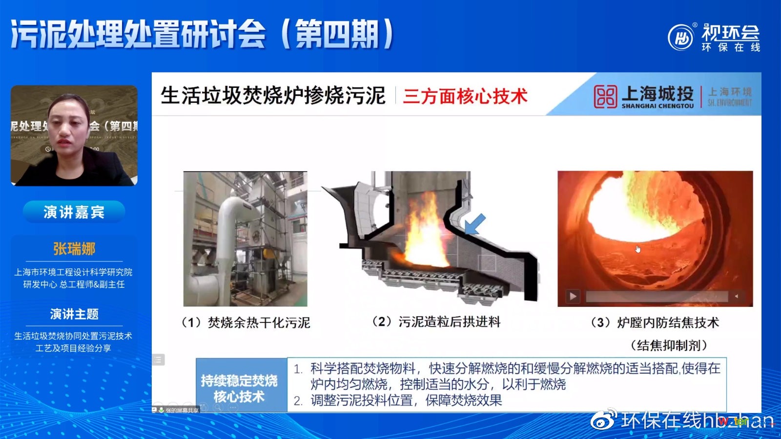 2022視環(huán)會(huì)秋季展開(kāi)展期間,上海市環(huán)境工程設(shè)計(jì)科學(xué)研究院 研發(fā)中心總工程師&副主任 張瑞娜 上線污泥處理處置研討會(huì)(第四期),重點(diǎn)進(jìn)行了圍繞污水污泥的協(xié)同處置——生活垃圾焚燒爐摻燒污泥——的經(jīng)驗(yàn)分享。