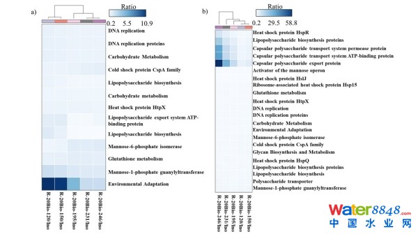 具體成果如下:低溫抑制厭氧發(fā)酵的主要原因。相比于細菌,古菌(主要指產(chǎn)甲烷菌)對低溫更敏感,能夠引起反應(yīng)器內(nèi)中間代謝產(chǎn)物產(chǎn)生和降解速度不平衡,造成揮發(fā)性脂肪酸累積和甲烷產(chǎn)量低;細菌和古菌對溫度的響應(yīng)存在差異,利用宏組學(xué)技術(shù)結(jié)合KEGG代謝通路數(shù)據(jù)庫,發(fā)現(xiàn)古菌中僅編碼兩種耐冷基因(Htpx、CspA)(圖1a),但細菌中編碼多種耐冷基因,如HslJ、Hsp15、CspA、MerR、HtpX、HspQ(圖1b),說明古菌的耐冷能力較差,導(dǎo)致古菌倍增速率明顯低于細菌。因此,提高反應(yīng)器中產(chǎn)甲烷菌的豐度及耐冷能力是促進低溫產(chǎn)甲烷的關(guān)鍵。