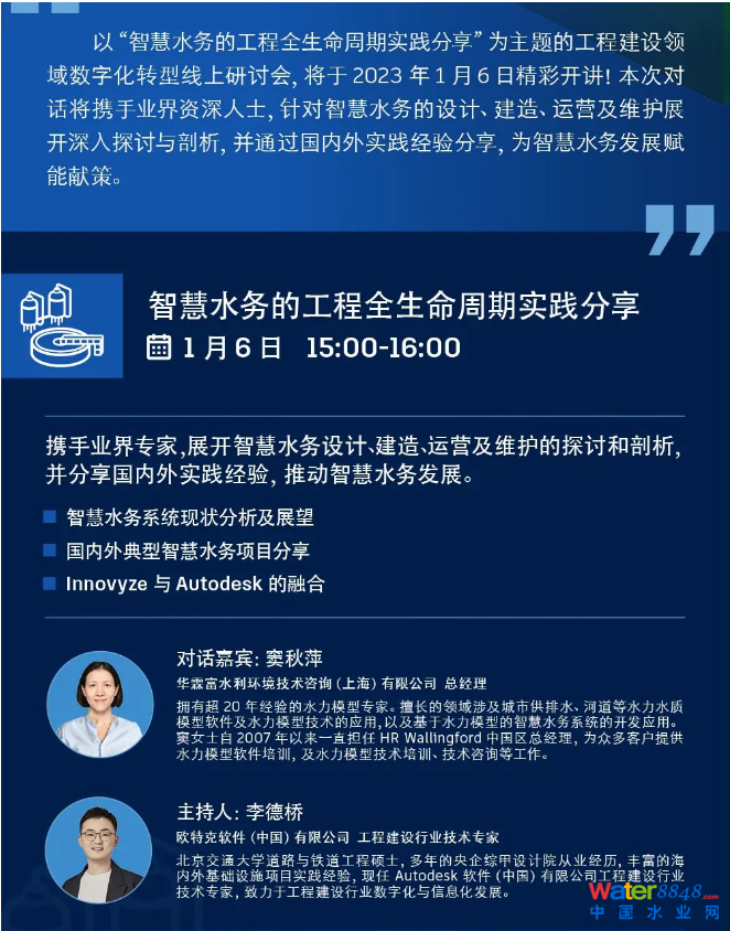 以“智慧水務(wù)的工程全生命周期實踐分享”為主題的工程建設(shè)領(lǐng)域數(shù)字化轉(zhuǎn)型線上研討會,將于2023年1月6日精彩開講!本次對話將攜手業(yè)界資深人士,針對智慧水務(wù)的設(shè)計、建造、運營及維護展開深入探討與剖析,并通過國內(nèi)外實踐經(jīng)驗分享,為智慧水務(wù)發(fā)展賦能獻策。