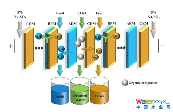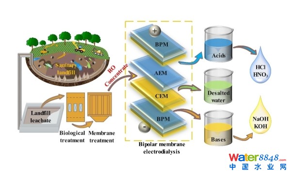 圖1.雙極膜電滲析處理垃圾滲濾液膜濃縮液并同步制備無機酸堿的工藝