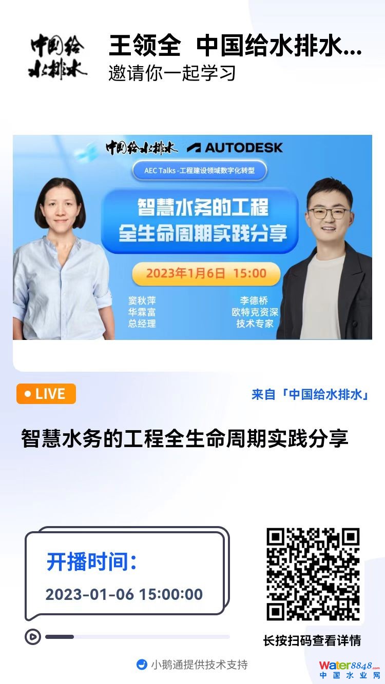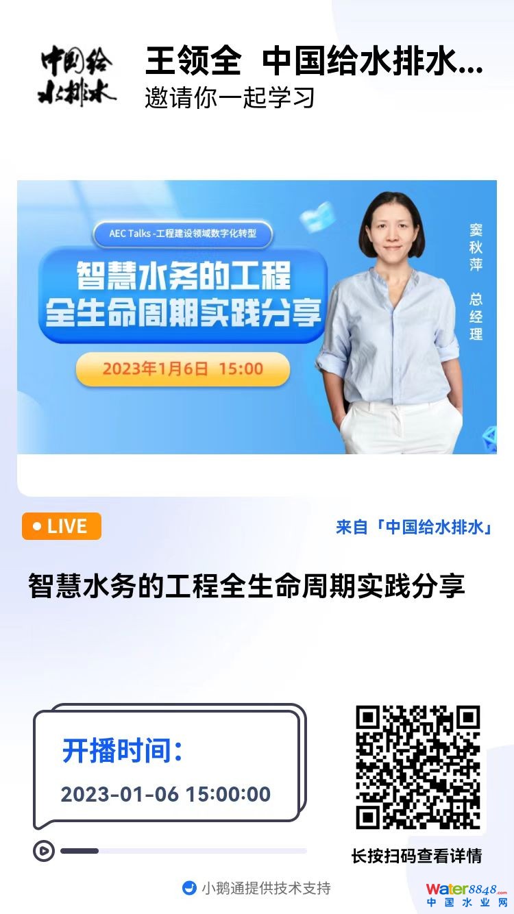 智慧水務(wù)的工程全生命周期實(shí)踐分享 直播時(shí)間:2023年1月6日 15:00-16:00