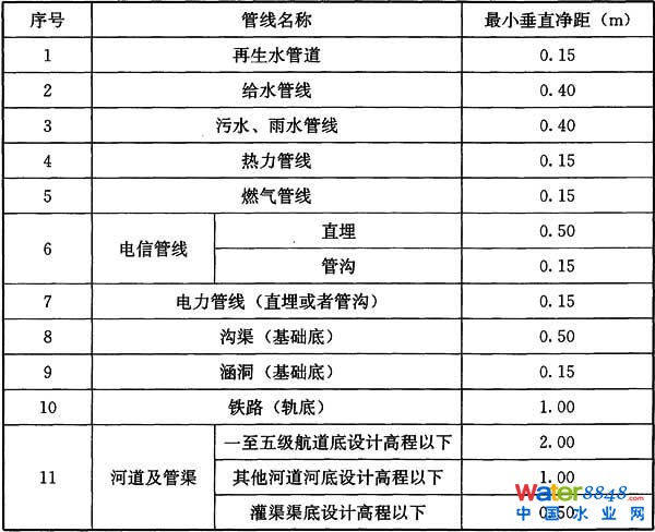6.1.7 再生水管道與其他管線交叉時(shí)的最小垂直凈距,應(yīng)按本規(guī)范附錄B的規(guī)定確定。