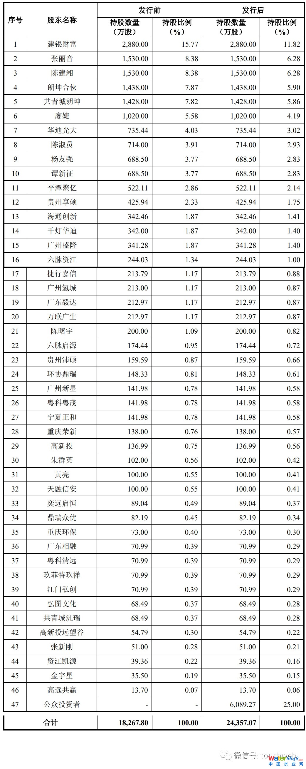 IPO后,建銀財富持股為11.82%,陳建湘、張麗音分別直接持股為6.28%,朗坤合伙持股為5.9%,共青城朗坤持股為5.86%,廖婕持股為4.19%,迪光大持股為3.02%,陳淑員持股為2.93%,楊友強、譚新征分別持股為2.83%,平潭聚億持股為2.14%,貴州享碩持股為1.75%,海通創(chuàng)新持股為1.41%;