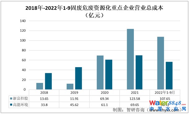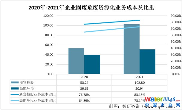 從營業(yè)成本來看,自2020年以來兩家企業(yè)固廢危廢資源化的營業(yè)成本也呈現(xiàn)出逐年上升的趨勢,2021年,浙富控股和高能環(huán)境的固廢危廢資源化營業(yè)成本分別為102.8和50.94億元,占總成本比重為83.18%和73.14%。