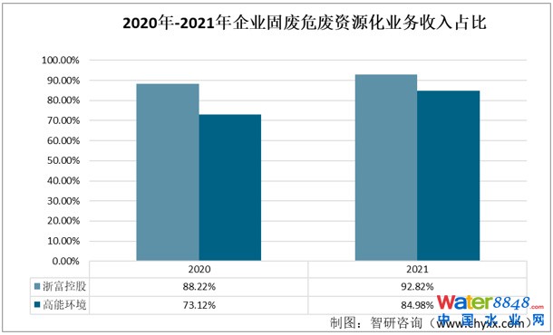 兩家企業(yè)的固廢危廢資源化業(yè)務(wù)收入占比都達到了70%以上,可見固廢危廢資源化業(yè)務(wù)是兩家企業(yè)的主營業(yè)務(wù)。2021年,浙富控股和高能環(huán)境的固廢危廢資源化業(yè)務(wù)占比分別為92.82%和84.98%。