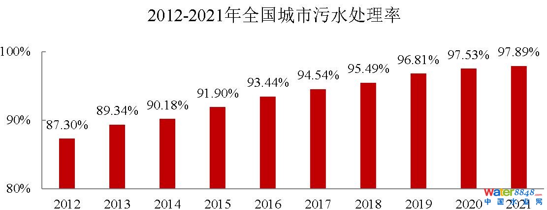 2021年年末,全國(guó)城市排水管道總長(zhǎng)度87.2萬公里,同比增長(zhǎng)8.7%;污水處理廠處理能力2.1億立方米/日,同比增長(zhǎng)7.8%。2021年,污水處理率97.89%,比上年增加0.36個(gè)百分點(diǎn);城市生活污水集中收集率68.6%,比上年增加3.8個(gè)百分點(diǎn)。