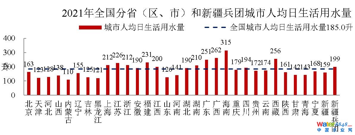 從行政分區(qū)看,海南省城市人均日生活用水量超過300升,廣西、西藏、廣東、福建、江蘇、浙江、上海、湖南和江西9個(gè)。▍^(qū)、市)超過200升(含);四川、湖北、安徽、重慶、云南、貴州、寧夏、北京、陜西、新疆、遼寧11個(gè)。▍^(qū)、市)和新疆兵團(tuán)超過150升;青海、甘肅、河南、山西、河北、山東、吉林、天津、黑龍江和內(nèi)蒙古10個(gè)。▍^(qū)、市)超過100升。