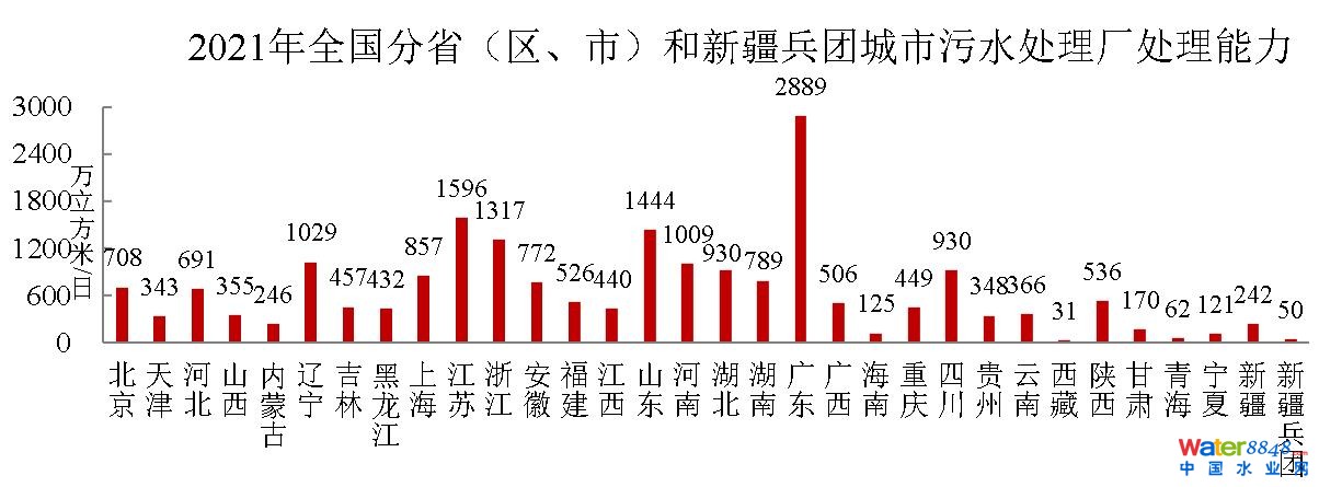 從行政分區(qū)看,廣東、江蘇、山東、浙江、遼寧和河南6個(gè)省份城市污水處理廠處理能力超過1000萬立方米/日;湖北、四川、上海、湖南、安徽、北京、河北、陜西、福建和廣西10個(gè)。▍^(qū)、市)在500-1000萬立方米/日之間;吉林、重慶、江西、黑龍江、云南、山西、貴州、天津、內(nèi)蒙古、新疆、甘肅、海南、寧夏13個(gè)。▍^(qū)、市)在100-500萬立方米/日之間;青海、西藏和新疆兵團(tuán)不足100萬立方米/日。