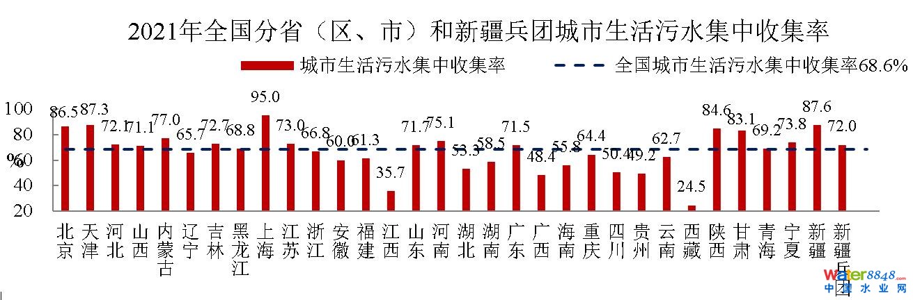 上海、新疆、天津、北京、陜西、甘肅、內(nèi)蒙古、河南、寧夏、江蘇、吉林、河北、山東、廣東、山西15個(gè)省(區(qū)、市)和新疆兵團(tuán)城市生活污水集中收集率超過70%;青海、黑龍江、浙江、遼寧、重慶、云南、福建、安徽、湖南、海南、湖北和四川12個(gè)省(市)在50%-70%之間;貴州、廣西、江西和西藏4個(gè)。▍^(qū))不足50%。