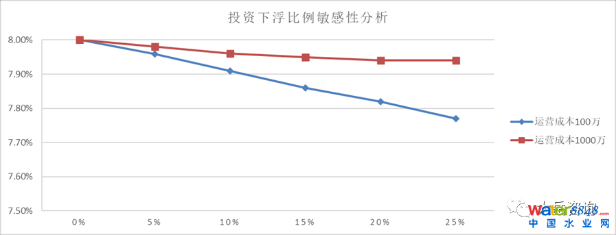 在初始投資相同的情況下,運營成本不同導(dǎo)致相同投資下浮帶來的財務(wù)分析指標基準值變化不同。如上圖所示,如果財務(wù)分析指標基準值變化1%是政企合作的臨界值,則項目運營成本為100萬時,該項目采用變動比例法將突破雙方的合作基礎(chǔ),即采用變動比例法不可行。