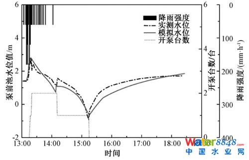 按照《城鎮(zhèn)內(nèi)澇防治系統(tǒng)數(shù)學(xué)模型構(gòu)建和應(yīng)用規(guī)程》(T/CECS 647-2019)的要求,通過收集3場獨(dú)立逐分鐘降雨數(shù)據(jù)及其對應(yīng)的排水系統(tǒng)泵站前池水位和泵站運(yùn)行記錄,并對其中2套實(shí)測數(shù)據(jù)和模擬結(jié)果進(jìn)行對比,開展參數(shù)率定和模型驗(yàn)證。