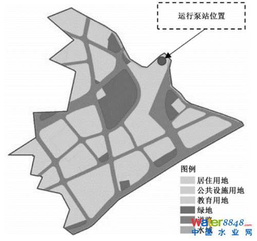 選擇上海市中心城排水系統(tǒng)A為研究區(qū)域,面積約68.8hm²,規(guī)劃以公共設(shè)施用地為主,詳見圖1和表1。排水系統(tǒng)A現(xiàn)狀為合流制,設(shè)計重現(xiàn)期為1年一遇。近年來結(jié)合道路改建,部分雨水管隨道路翻建,按5年一遇建設(shè),現(xiàn)狀雨水管管徑為DN300~2 200。現(xiàn)狀2個泵站,其中一個泵站已停用,正常運(yùn)行的泵站位置如圖1所示,流量為8.4m³/s。