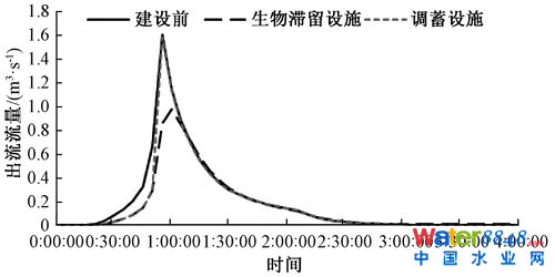 結(jié)果表明,調(diào)蓄設(shè)施峰值流量為1.58m³/s,生物滯留設(shè)施峰值流量為0.99 m³/s(如圖6所示)。由模擬結(jié)果可知,調(diào)蓄設(shè)施削峰效果比生物滯留設(shè)施削峰效果差,其削峰能力、容積利用能力約為生物滯留設(shè)施的63%,主要與生物滯留設(shè)施底部結(jié)構(gòu)層的滯蓄作用相關(guān)。
