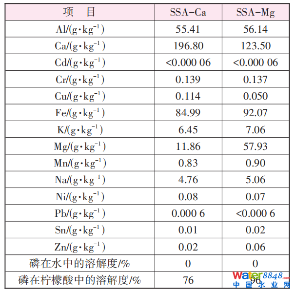 SSA-Ca和SSA-Mg中重金屬含量及所含磷在水中和2%檸檬酸中的溶解度情況見(jiàn)表2。